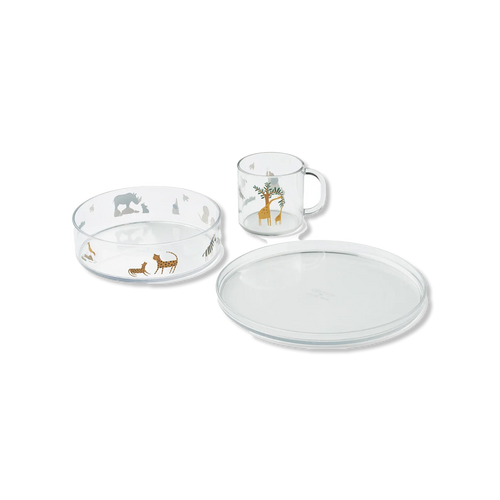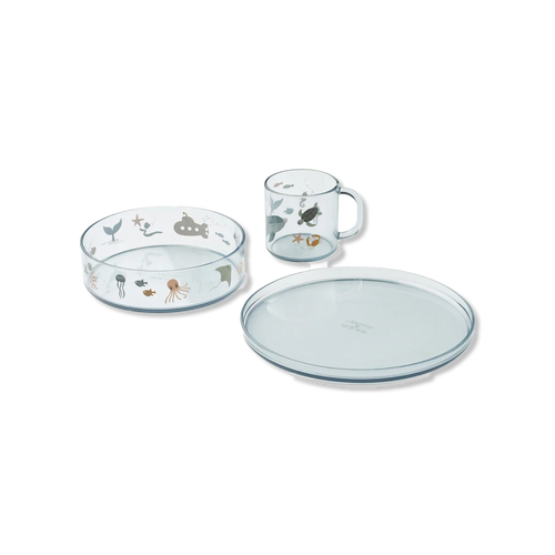 Przezroczysty zestaw obiadowy z niezwykle wytrzymałego Tritanu, z naprawdę ładnymi nadrukami. Zestaw obiadowy składa się z miski, talerza i kubka. Zestaw można myć w zmywarce w temperaturze do 60 stopni.