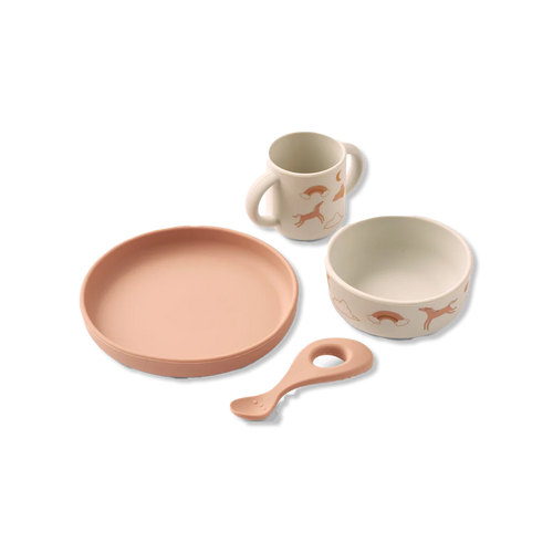 Ten popularny zestaw obiadowy LIEWOOD zawiera kubek, miseczkę, talerzyk i łyżeczkę – idealny dla niemowląt i małych dzieci. Wykonany z wytrzymałego i nietłukącego silikonu, idealnie nadaje się do codziennego użytku.